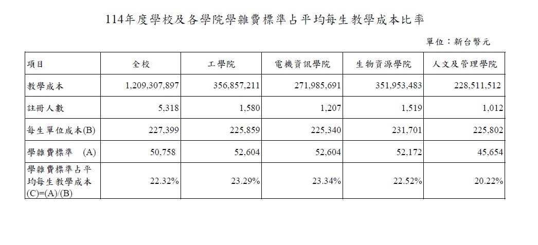 114年度學校及各學院學雜費標準占平均每生教學成本比率